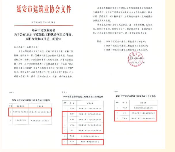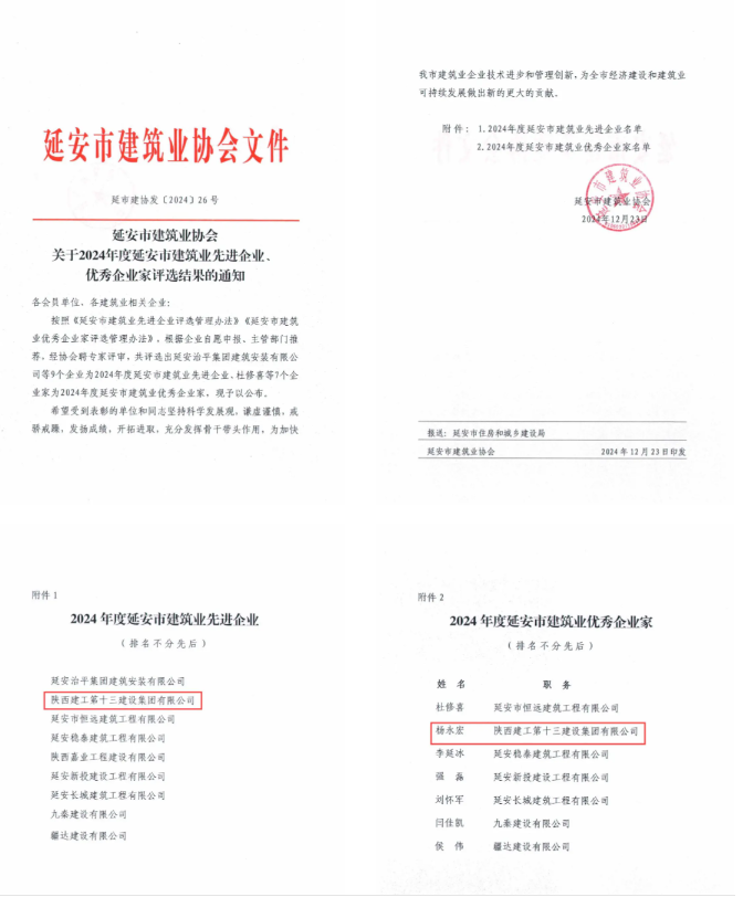 2024年,在延安市委、市政府和陜建集團黨委的堅強領(lǐng)導下,十三建集團貫通落實黨的二十屆三中全會精神和習近平總書記歷次來陜考察重要講話重要指示,踐行“11359”工作方針,突出經(jīng)營提質(zhì)、改革蓄能、管理強基、品牌增效、黨建聚力“五個抓手”,沉著應變、綜合施策,在復雜的環(huán)境和不利的行業(yè)形勢中穩(wěn)步前行,先后榮獲延安市建筑業(yè)穩(wěn)增長優(yōu)秀企業(yè)、全國工程建設AAA級信用企業(yè)等榮譽。